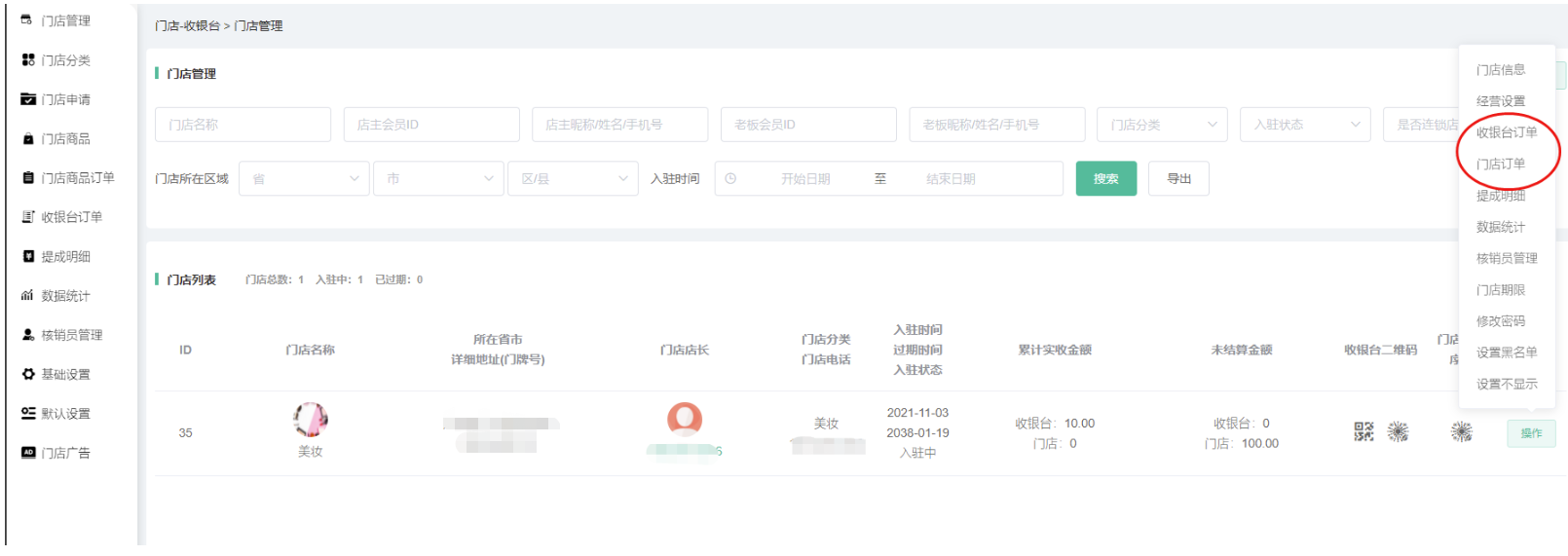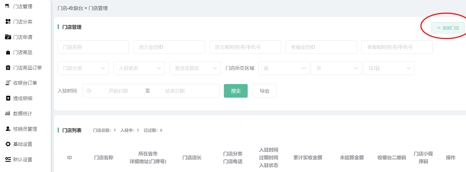 申请通过/后台添加的门店,在门店信息显示,可搜索查看门店的id、名称、所在省市详细地址、门店店长、门店分类、入驻时间、累计实收金额、未结算金额、收银台二维码、门店小程序码等