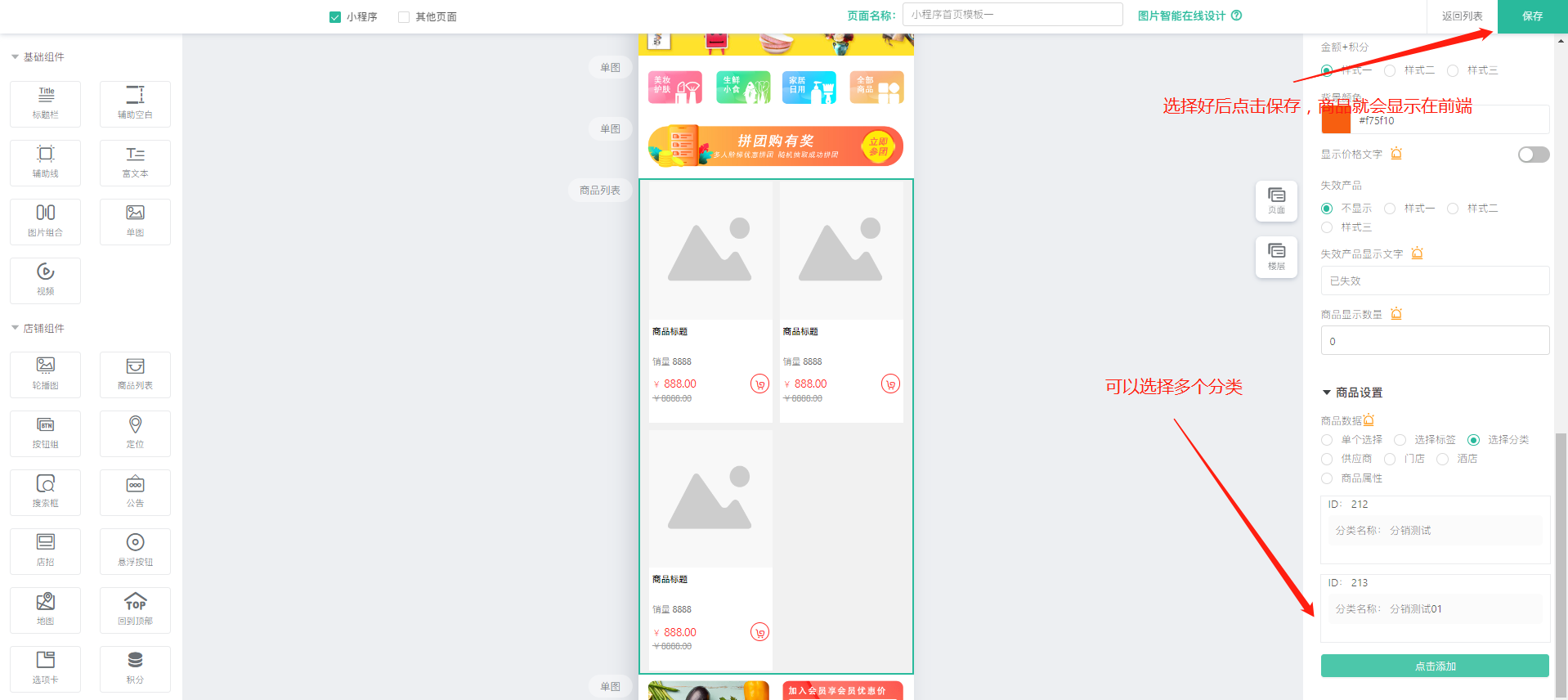 ②有三种方法可以展示前端,第一:拖拽左边组件:商品列表到中间首页模板的区域
