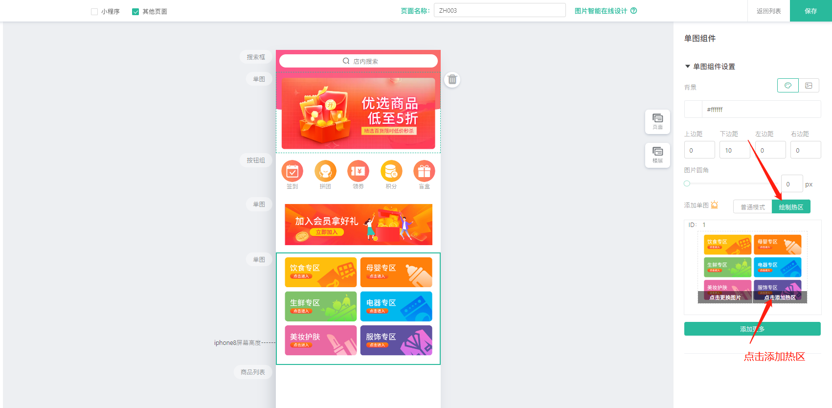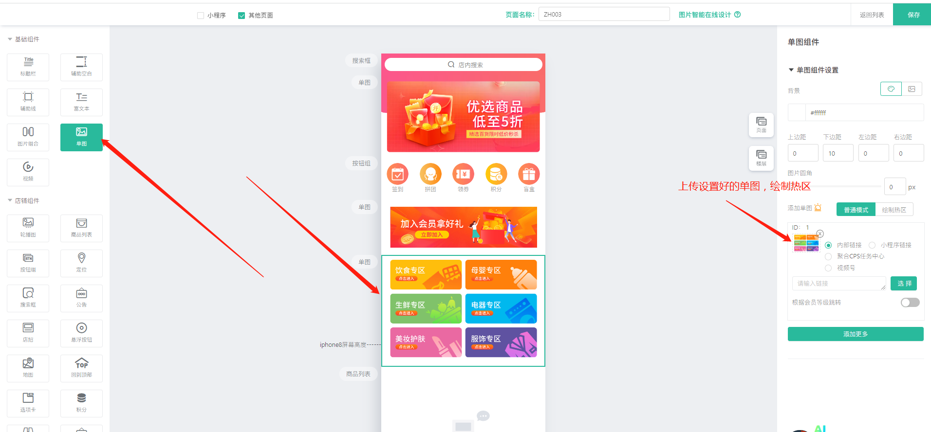 ⑧、第三种方法,可以拖动单图,上传设计好的单图,如果这张单图有多个专区,可以绘制热区,选择对应的商品 分类