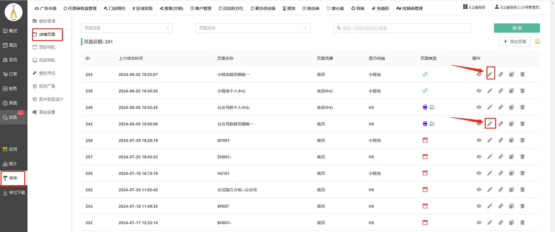 2.在装修页面--找到默认为公众号/小程序的商城首页的页面---进行编辑,如下图所示: