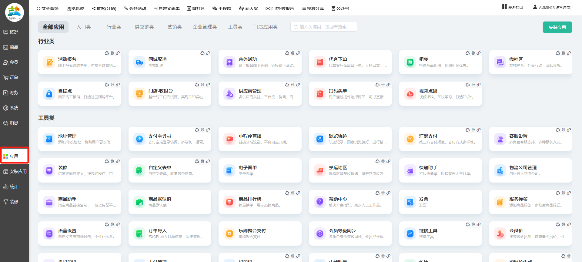 目录 搜索 展开 一、前期准备资料二、数字乡村码-上线操作指南1、服务号的申请流程及认证2、申请小程序流程3、开放平台绑定小程序和公众号三、数字乡村码-系统操作数字乡村码系统管理-概况数字乡村码-商品管理1、发布商品2、商品列表3、商品表单4、商品分类5、品牌管理6、配送模板7、评论管理8、优惠券管理9、商品标签10、退货地址设置11、满额优惠12、批量操作13、配送方式14、基础设置15、商品隐藏四、数字乡村码-会员管理1、全部会员2、会员等级3、会员分组4、资格申请5、会员设置6、推广中心设置7、会员邀请码8、会员关系链修改关系链修改记录9、会员合并记录10、账号注销管理11、会员设置中心五、数字乡村码-订单管理1、订单管理列表2、订单处理流程3、订单状态4、订单修改价格5、订单退款退货6、多包裹发货7、批量发货订单操作步骤8、催发货订单9、物流查询六、数字乡村码-财务管理1、余额设置2、会员余额3、充值记录4、转让记录5、余额明细6、收入明细7、提现设置8、提现统计9、积分管理10、转账审核11、收益广告12、批量充值七、数字乡村码-系统管理1、商城入口2、商城设置①、商城设置②、订单设置③、物流查询④、短信⑤、联系方式⑥、分类⑦、优惠券⑧、分享⑨、幻灯片⑩、广告位⑫、地图设置3、交易设置4、微信模板消息自定义消息模板(新版)自定义消息模板(旧版)小程序消息模板公众号模板消息变更公告5、语言设置6、权限管理7、多媒体管理八、数字乡村码-消息管理九、数字乡村码-应用管理十、数字乡村码系统-数据统计十一、数字乡村码-页面装修DIY1、模板管理2、店铺页面3、顶部导航4、底部导航5、DIY模板市场6、首屏广告7、基础设置8、装修DIY尺寸建议十二、供应商功能插件操作指南1、供应商2、门店-收银台门店申请和使用步骤门店管理①、门店-收银台 营销设置②、门店-收银台 分润设置门店分类门店申请门店审核门店商品门店商品订单收银台订单数据统计核销员基础设置默认设置门店装修3、微社区4、会务活动十三、营销插件操作指南活动报名提货卡新人奖微店问卷调查积分视频分享1、视频分享基础设置2、视频分享发现管理3、视频分享分类管理4、视频分享评论管理5、视频分享分红记录6、视频分享短视频中心每日红包幸运大抽奖签到优惠券二维码任务奖励优惠劵文章音频文章付费文章限时购新海报拓客卡操作流程积分活动素材中心视频红包十四、入驻门店应用类1、门店预约2、附近商品3、门店定位设置4、门店控制5、门店满额包邮6、门店满额减7、导入商品8、门店搜索9、门店股东10、核销券11、多门店核销1、商城后台设置2、前端功能演示十五、常见问题1、后台登录密码修改流程2、会员-余额,积分,后台如何进行充值与扣除3、如何修改上下级关系4、一种万能的获取商城小程序路径的方法 暂无相关搜索结果! 阅读次数:1463 本文档使用 模王系统 发布 九、数字乡村码-应用管理 九、商城管理-应用显示所有商城已安装并启用的应用,包含以下大类:具体根据自家商城后台系统显示为准。每个应用功能设置步骤较多,请查看相对应应用的学习文档。文档更新时间: 2024-01-08 10:36 作者:链上旅行